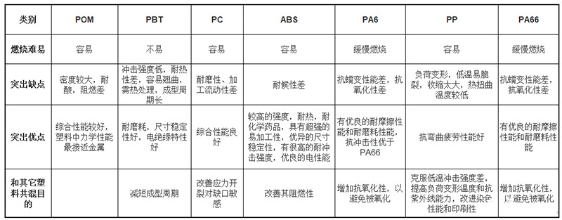 常用的材质主要有 PA6、PA66、ABS、PBT、pp 等,笔者总结了它们的具体性能差异,见表 2。设计插件时可根据不同的需求选择不同的材质,还可根据实际情况在塑料中添加阻燃或增强材料,以达到增强或阻燃的目的,如添加玻璃纤维增强等。